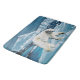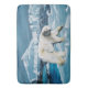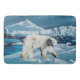 Ein weißer Eisbär im Schnee der Arktis des Winters mit einem Eisberg im Hintergrund
