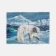 Ein weißer Eisbär im Schnee des arktischen Winters mit einem Eisberg im Hintergrund
