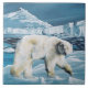 Ein weißer Eisbär im Schnee des arktischen Winters mit einem Eisberg dahinter.