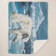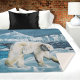 Ein weißer Eisbär im Schnee des arktischen Winters mit einem Eisberg dahinter.
