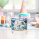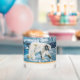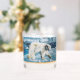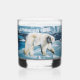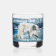 Ein weißer Eisbär im Schnee des arktischen Winters mit einem Eisberg dahinter.
