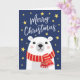Eine Urlaubskarte mit einer Abbildung eines niedlichen kleinen Eisbären mit rotem Schal. Dunkelblauer Hintergrund mit gelben Sternen und weißem Text "Frohe Weihnachten".
