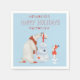 Weiße Weihnachtsszene mit großen und kleinen Eisbären, die ihren Baum schmücken. Aquarellbilder auf hellblauem Hintergrund mit rot gezeichneter "Happy Holidays"-Meldung