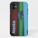 Ein Eisbär (Ursus maritimus) ramt in der langen Polarnacht durch das Eis; die Nordlichter in rot und grün leuchten in der Ferne. Text mit "Alaska" in leuchtendem Blau und Weiß erscheint ebenfalls.