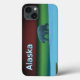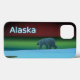 Ein Eisbär wandert in der langen Polarnacht durch das Eis; die Nordlichter in rot und grün leuchten in der Ferne. Text mit "Alaska" in leuchtendem Blau und Weiß erscheint ebenfalls.