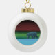 Ein Eisbär wandert in der langen Polarnacht durch das Eis; die Nordlichter in rot und grün leuchten in der Ferne.