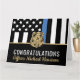 This design features a police force flag with black and white stripes, and a thin blue line stripe as well. A great way to say congratulations to the new police academy graduate. Customize with the name of the graduating law enforcement officer in gold. Celebrate this milestone in style!