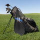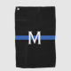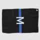 Dieses türkisblaue Handtuch hat einen horizontalen blauen Streifen auf schwarzem Hintergrund und ein Monogramm in weiß, das Sie personalisieren können.