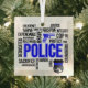 Dieses Ornament hat das Wort Polizei in blau zusammen mit mehreren Worten, die beschreiben, was ein Polizeibeamter ist und tut.