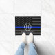 Eine mit Monogramm und Namefußmatte, die eine dünne blaue Linie Polizei kennzeichnet, redete amerikanische Flagge an. Das Monogramm wird innerhalb eines weißen stilisierten Kranzes mit dem Nachnametext im weißen Text darunterliegend zentriert. Eine elegante und stilvolle Weise, einen Eindruck auf Ihrer Türstufe bei der Darstellung des Blaus zu machen.