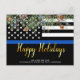 Senden Sie frohe Weihnachtsgrüße an Freunde, Familie, Kollegen von Strafverfolgungsbehörden und Ihre Gemeinde mit dieser einzigartigen Thin Blue Line Police Frohe Weihnachtskarte - American Flag in polizeilichen Flaggen Farben, modern schwarz und blau mit heiligen Blätter und Beeren und eleganten goldenen Drehbuch. Personalisieren Sie Ihre Nachricht und Ihren Familiennamen oder Ihre Polizeiabteilung. Diese Weihnachtskarten der Polizei sind perfekt für Polizei- und Strafverfolgungsfamilien sowie Polizeidienststellen. COPYRIGHT © 2020 Judy Burrows, Black Dog Art - Alle Rechte vorbehalten. Polizei Weihnachten glückliche Feiertage Thin Blue Line Urlaub Postkarte