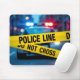 Gelbes Polizeiband mit dem Text "DO NOT CROSS" wird hervorgehoben dargestellt, was die Sicht auf ein Polizeiauto mit blinkenden Lichtern blockiert