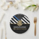 Ein guter Weg, um dem neuen Rentner oder Absolvent für ihren Ruhestand oder Abschluss von der Polizeiakademie zu gratulieren. Dieses Design verfügt über eine Polizeiflagge mit schwarz-weißen Streifen und einen dünnen blauen Streifen. Passen Sie den Namen des im Ruhestand befindlichen oder schließend Vollzugsbeamten, Sheriffs, Kapitäns oder Chefs an. Feiern Sie diesen Meilenstein im Stil!