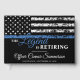 Dieses Design verfügt über eine Polizeiflagge mit schwarz-weißen Streifen und einen dünnen blauen Streifen. Der Text "The Legend is Retiring" liegt über dem anpassbaren Namen des pensionierenden Strafverfolgungsbeamten, Sheriffs, Kapitäns oder Chefs. Feiern Sie diesen Meilenstein im Stil!