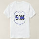 Dieses Shirt ist mit einem blauen Schild um das Wort "Sohn" herum versehen, das eine dünne blaue Linie durch sich hat, um der Welt lassen, dass Sie Ihre Eltern unterstützen.