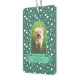 Zeichnen Sie ein vertikales Foto Ihres Tieres in einem klassischen Bogenrahmen aquamarin mit einem Banner für seinen Namen. Hintergrund sind weiße Polka Punkte auf aquamarin.