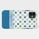 Schützen Sie Ihr iPhone 5 in diesem hübschen Fall. Mit einem echten Mädchen-Look, ist dieses Gehäuse in Weiß gemacht, mit einem grünen und blauen Polka-Punkt-Muster, oben, und ein massives Blau auf dem Boden des Gehäuses. Ein hellblauer Streifen verläuft in der Mitte, mit benutzerdefiniertem, blauen Skripttext. Personalisieren Sie diesen hübschen Schlag für sich selbst oder als großartige Geschenkidee.