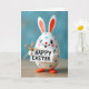 This card features a smooth, egg-shaped bunny figure standing front and center against a softly blurred sky-blue background 🐰. The figure is bright white with small blue polka dots, and its long ears show orange-red inner panels that match its tiny round feet. A small red nose, faint pink blush on the cheeks, and wide black line-drawn eyes create a friendly, tender expression, with a little tongue peeking from the smile like it’s sharing a private joke. Held close to its body, as if offering it to someone special, is a white rectangular sign hanging from a simple twine bow. The words “HAPPY EASTER” sit in the middle of the sign in black uppercase lettering, standing out clearly against the white space 🌷. Soft, even lighting adds a gentle sheen to the figure’s smooth surface and keeps shadows minimal while the background stays dreamy and out of focus. The twine is tied at the top of the sign in a small bow, with thin strands leading up to the bunny’s hands.