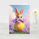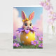 Entworfen mit einem süßen, stilisierten Hasen, der aus einem übergroßen, dekorierten Ei schaut, konzentriert sich diese Karte auf große, dunkle, funkelnde Augen und ein kleines, nach oben gerichtetes Lächeln, das wie ein schüchternes Hallo wirkt 🐰. Ein hellgelbes Band sitzt auf seinem Kopf und rosige Wangen wärmen sein weiches, pfirsichfarbenes Fell. Der Hase lehnt sich vor, als ob er einen privaten Moment mit dem Betrachter teilt, was der Szene eine sanfte, freundliche Nähe verleiht. Um ihn herum bilden mehrschichtige, violette Blütenblätter eine blumenähnliche Hülle, die sich wie ein Blumenstrauß um den Charakter herum öffnet 🌷. Darunter liegt eine sonnengelbe Ei-Form, die mit kleinen weißen Tupfen gepunktet ist und auf einem ordentlichen Stück reichen grünen Grases ruht. Jeder Grußtext