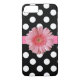 Hübsches iPhone 7 Gehäuse in schwarz, mit weißen Polka Punkte getan. Realistische Grafiken eines rosa Grosgrain Band, mit einem rosa Gerber-Disy dekoriert die Mitte. Lieblich, um stilvoll zu sein und Ihr Telefon gleichzeitig zu schützen. Anpassen, um jeden gewollt Text hinzuzufügen.