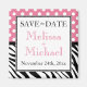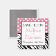 Stilvolle Sonderanfertigung Speichern Sie die Datumsmagnete für die Ankündigung Ihrer Hochzeit, die mit weißen Polka-Punkten über Rosa oben und schwarz-weißem Zebradruck unten gestaltet wurde.