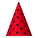 Roter Hintergrund mit schwarzen Polka-Punkten.