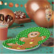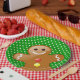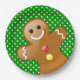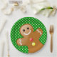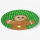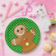 Weiße Polka Punktmuster auf einem hellen Grün mit einem großen Lebkuchenmann mit roten und gelben Gummiknöpfen.