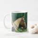 Foto eines Polopony Kopf und Schultern mit einem Fahrer und grünem Hintergrund des Polofeldes. Auf beiden Seiten bedrucktes Design.