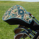 This retro look golf head cover will remind you of the beach, surf, and sand. Swirls of Polynesian waves reveal tropical blue and green jewel tones of the South Pacific and palm trees in a retro style, remniscent of beach-inspired ethnic art or tattoos.