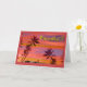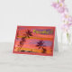 Hawaiianische Sonnenaufgangsszene in leuchtenden und schönen Farben. Deckungstext heißt "Viel Glück!" Pomaikai. Palmen, die in den tropischen Winden wehen und in warmen und coolen Pastellfarben gehalten werden. Art, Bild und Vers Copyright © Shoaff Ballanger Studios, 2022.