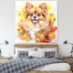 Wasserfarbe eines Pomchi (Spitz/Chihuahua) Hundes mit bräunlichem und weißem Fell und spitzen Ohren, die unter den Herbstlauben lächeln.