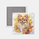 Wasserfarbe eines Pomchi (Spitz/Chihuahua) Hundes mit bräunlichem und weißem Fell und spitzen Ohren, die unter den Herbstlauben lächeln.