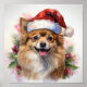 Eine Abbildung eines bräunlichen Pomchi (Spitz/Chihuahua)-Hundes, der eine Weihnachtsmannmütze zwischen Heiligbeeren, Blätter und Baumzweigen trägt.