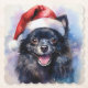Eine Abbildung eines schwarzen Pomchi (Spitz/Chihuahua)-Hundes mit einer Weihnachtsmannmütze mit blauem und lila Aquarellhintergrund.