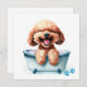 Niedlicher Hund Aquarellbilder eines glücklich flauschigen, braunen Poodle-Hundes in einer Badewanne. Ideal für Hundefreunde.