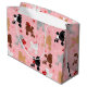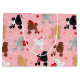 Niedliche Valentinstag-Poodles mit schwarz, weiß, grau, aprikot und braun farbigen Mäntel in Rot, Rosa und Weiß-Polka-Dot und Pullover mit verstreuten Pfotendrucken und Pfeil auf einem rosa Hintergrund.