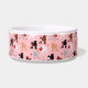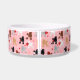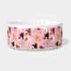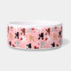 Niedliche Valentinstag-Poodles mit schwarz, weiß, grau, aprikot und braun farbigen Mäntel in Rot, Rosa und Weiß-Polka-Dot und Pullover mit verstreuten Pfotendrucken und Pfeil auf einem rosa Hintergrund.