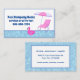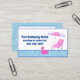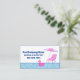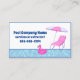 Diese farbenfrohe Visitenkarte bietet eine Poolreinigung oder ein anderes Thema. Die Vorderseite hat einen realistischen Blick auf das Wasser entlang des unteren Teils, ähnlich wie ein Garten Pool. Eine rosa Flamingo-Floatie bobbt auf dem Wasser, und ein rosa Rasen-Sessel mit Schirm befindet sich auf dem Deck.