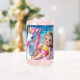 A cute young girl gently drifts on a pink and white unicorn float, gliding across a crystal-clear, blue swimming pool.