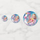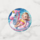 A cute young girl gently drifts on a pink and white unicorn float, gliding across a crystal-clear, blue swimming pool.