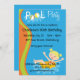 Dieses niedliche Schwimmbad Party Geburtstagsfeier Einladung zeigt ein kleines blondes Mädchen, das in einem inneren Schlauch auf einem blauen Hintergrund spritzt. Vollständig anpassbar.