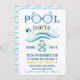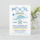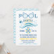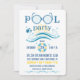 Moderne Pool-Party Einladung. Die Sommersonne, die Wellen, der Strandball, die Innenröhre und die Sonnenbrille bilden das Wort "Pool". Auf der Rückseite der Karte befindet sich ein niedliches Wellenmuster.
