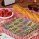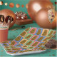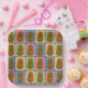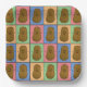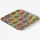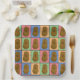 Vergnügliche Pop Art Papier Teller mit einem Muster von verschiedenen farbigen Rechtecken jeweils mit einer glücklichen braunen Kartoffel in der Mitte.