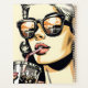 Hübsches Comic Buch Pop Art Retro hübsche Dame trinken Soda mit Sonnenbrille auf mit einem Sonnenuntergang Reflexion.