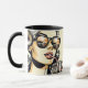 Personalisierte Kaffeetasse. Hübsches Comic Buch Pop Art Retro hübsche Dame trinken Soda mit Sonnenbrille auf mit einem Sonnenuntergang Reflexion.