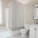 Der Duschvorhang ist mit einem farbenfrohen Muster aus grafischen Makaronkochen in verschiedenen Farbtönen gestaltet. Diese gebackenen Goodies sind im Moment sehr beliebt und machen ein wunderbares Thema dieses Pops Art inspiriert Design.