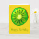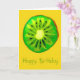 Eine niedliche und farbenfrohe Geburtstagskarte mit einer lebendigen Kiwi-Fruchtscheibe aus einem Originalgemälde der Künstlerin Sacha Grossel. Dieses große Fruchtstück im Pop ist grün und sehr hell und farbenfroh, vor einem individuell gestaltbaren, gelben Hintergrund. Quirkisch und originell.