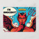 AI generierte Kunst eines Teufels mit Engelsflügeln in einem Comic-Buchstil, der besagt, ich bin unschuldig mit einem kleinen Blick auf den Text