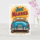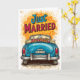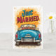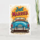 Diese gefaltete Grußkarte zeigt eine lebendige Pop-Kunstillustrierung eines Vintagen Cabrio-Autos, das von hinten betrachtet wird und für eine Hochzeitsfeier fröhlich dekoriert wurde. Über dem Auto ragt die Phrase "Just Married" in fett gedruckten Blockbuchstaben im Stil eines Comic, Set vor einem Hintergrund heller, fröhlicher Farben. Das Innere zeigt eine süße und skurrile Stimmung: "Sie wünschen sich eine Fahrt voller Romantik, Abenteuer und einen Kofferraum voller Träume." Und bietet auch Platz, um die Namen des Paares und Ihre Unterschrift, zusammen mit einem leeren Bereich für das Hinzufügen einer persönlichen P.S.-Note. Diese moderne Meeting-Retro-Karte ist die perfekte Touch für jedes Hochzeitsgeschenk, um Lächeln und gute Wünsche für den Weg voraus zu bringen.