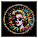 Ein lebendiges Pop-Kunstdesign besticht durch eine im Retro-Stil gehaltene Frau, die eine Sonnenbrille trägt und von farbenfrohen Comic-Linien umgeben ist. Der kühne Einsatz von Cyan, Magenta und Gelb schafft eine dynamische und energetische Komposition.